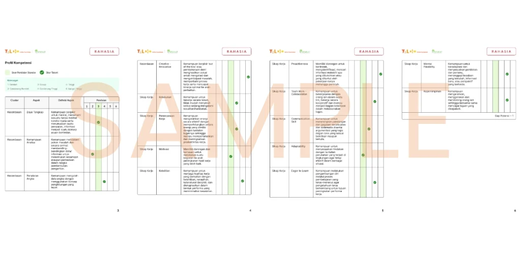 - Sikap Kerja: Ketekunan, Perencanaan Kerja, Motivasi, Ketelitian, Proactiveness, Kerjasama Tim, Kolaborasi, Komunikasi, Adaptability, Eagerness to Learn, Mental Flexibility, Kepemimpinan