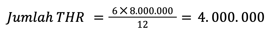 Misalnya seorang pekerja bernama Ridwan, yang menerima gaji sebesar 8 juta rupiah perbulan, telah bekerja selama 6 bulan terus menerus di sebuah perusahaan. Oleh karena itu menjelang hari rayanya Ridwan berhak mendapatkan THR dengan perhitungan sebagai berikut: