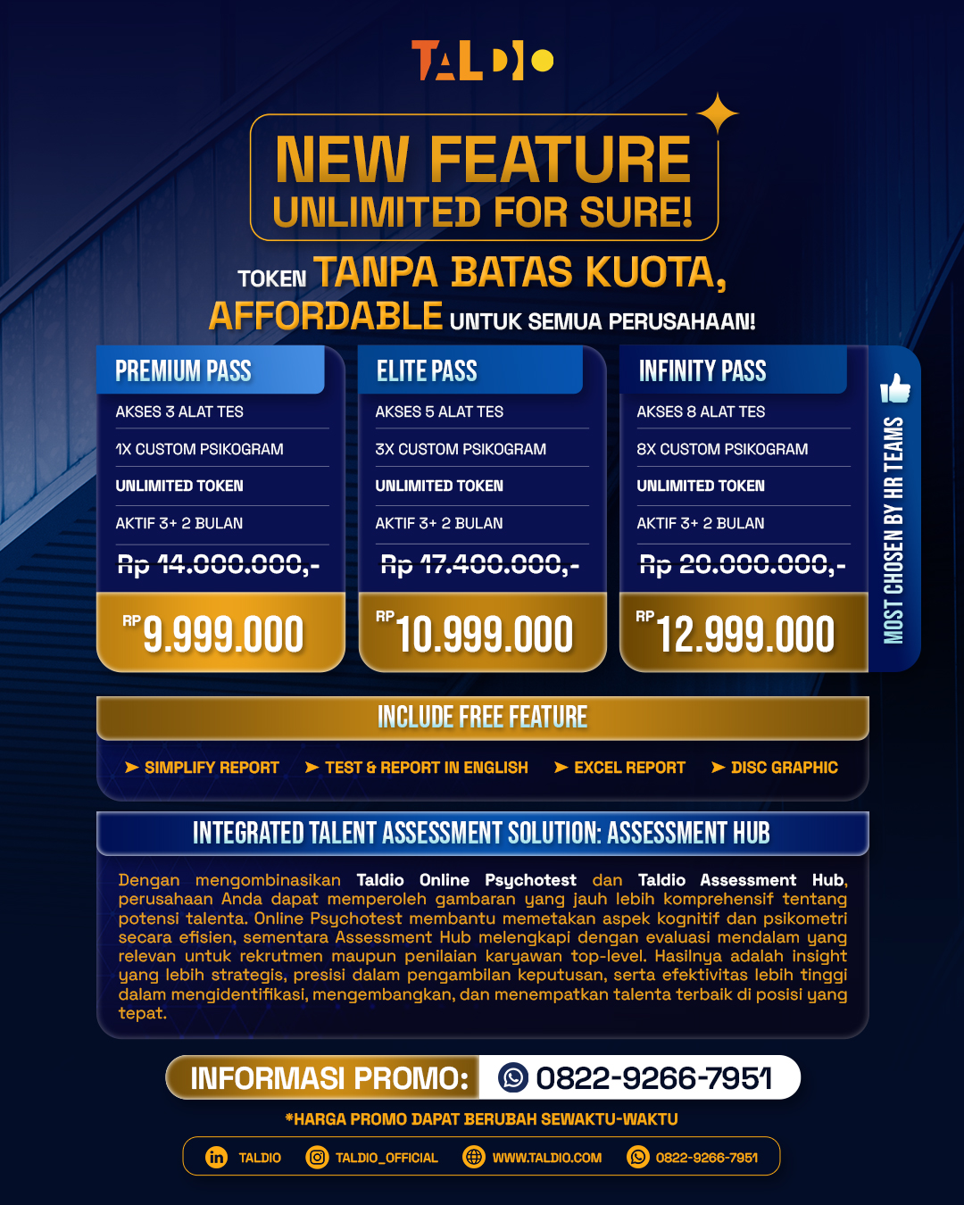 Taldio Online Psychotest dirancang untuk membantu perusahaan menilai dan mengembangkan kompetensi tim secara akurat dengan solusi berbasis data. Dengan analisa mendalam dari hasil tes talent, tim HR dapat mengambil keputusan yang lebih baik dalam rekrutmen, promosi, dan pengembangan karyawan, sehingga meningkatkan efektivitas tim. Proses asesmen dilakukan sepenuhnya secara online, memastikan akses yang mudah bagi perusahaan dan talent di mana saja. Dengan memilih Taldio, Anda mendapatkan solusi psikotes yang akurat, strategis, dan mudah digunakan untuk meningkatkan kualitas SDM di perusahaan Anda.